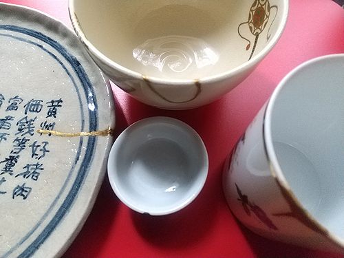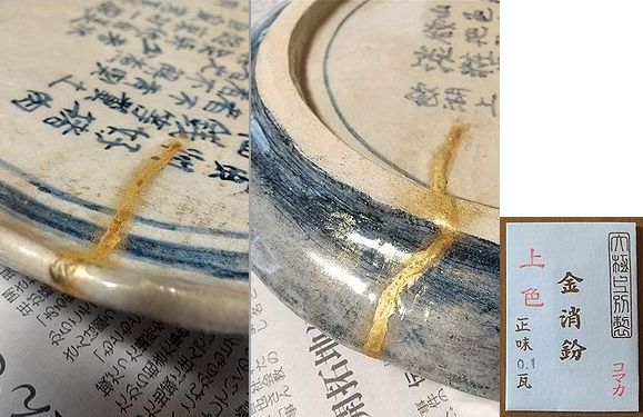 上の画像は、錆漆で補修してから、「弁柄漆」(べんがらうるし)を塗って、右の金粉を蒔いている段階
