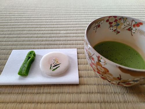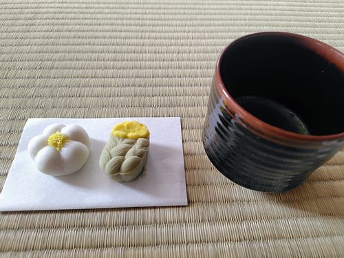 今月のお菓子は、厳寒でも凛と咲く白梅、福寿草の上生菓子と、干菓子